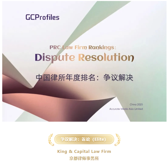 On September 16, GCProfiles (GCP) announced the “2025 GCP China Law Firm Annual Ranking: Dispute Resolution”, which is divided into two parts: ‘Litigation’ and “Arbitration”. The list is divided into “Litigation” and ‘Arbitration’, and law firms in the same echelon are categorized into “All-round” and “Elite”. King&Capital Law Firm was ranked in the “Dispute Resolution: Litigation (Elite)” list for its outstanding legal service capabilities, wide market recognition and excellent client reputation.