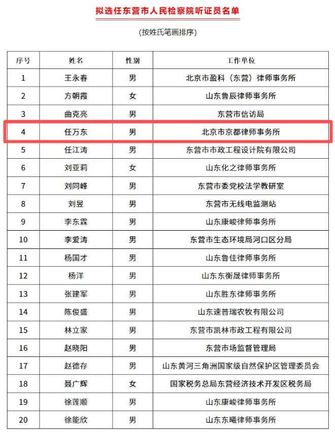 Recently, according to the supreme people's procuratorate “people's procuratorate hearing officer library construction and management guidance” and dongying people's procuratorate “dongying procuratorial organs hearing officer library construction and management of the implementation of the measures” and other relevant provisions, combined with the hearing officer selection of the public registration, qualification examination, organizational inspection, etc., by the dongying people's procuratorate decided to select the king&Capital Law Firm of Beijing, RenWantong lawyers as dongying city People's Procuratorate hearing officer, term of 3 years.