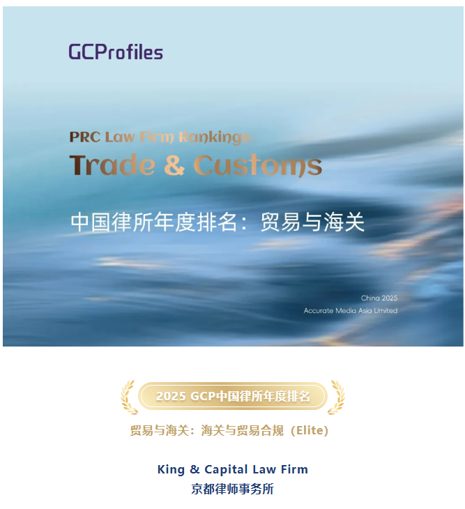 On December 16, GCProfiles (GCP) announced the “2025 GCP China Firm Rankings - Trade & Customs”, which is divided into two sections, “International Trade” and “Customs & Trade Compliance”, and categorized the same tier into “All-round” and “Elite”. The list is divided into “International Trade” and “Customs & Trade Compliance”, and law firms in the same echelon are categorized into “All-round” and “Elite”. King&Capital Law Firm was ranked in the “Trade & Customs: Customs & Trade Compliance (Elite)” category based on its outstanding legal service capabilities, wide market recognition, and excellent client reputation.