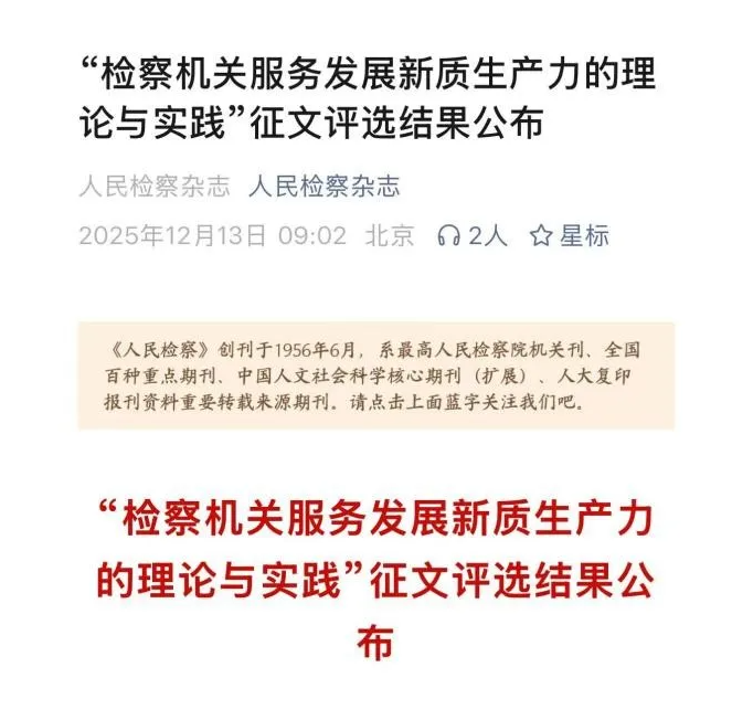 On December 13, 2025, the WeChat public number of People's Procuratorate magazine officially released the results of the “Theory and Practice of Procuratorial Organs Serving the Development of New Productivity”. This activity is jointly organized by Suzhou Municipal People's Procuratorate of Jiangsu Province, People's Procuratorate Magazine, and Suzhou Industrial Park People's Procuratorate of Jiangsu Province, aiming at responding to the requirements of the meeting of the Supreme Procuratorate, gathering the consensus of the theoretical and practical circles, exploring the effective paths for procuratorial organs to serve the development of new quality productive forces, and promoting the performance of procuratorial duties in a high-quality manner to empower high-quality development.