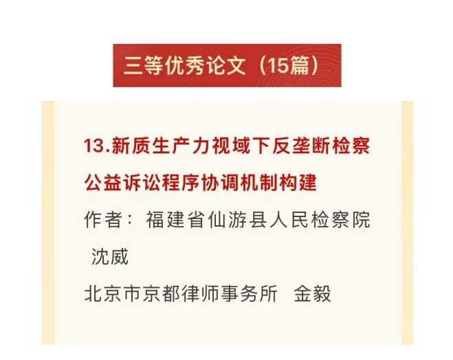Among the many entries, “Construction of Coordination Mechanism for Anti-monopoly Prosecution Public Interest Litigation Procedures under the Perspective of New Qualitative Productivity”, written by Mr. Jin Yi of Beijing King&Capital Law Firm in cooperation with Prosecutor Shen Wei of Xiangyou County People's Procuratorate of Fujian Province, was awarded the third prize by virtue of profound theoretical insights, solid practical analysis and innovative path conception.