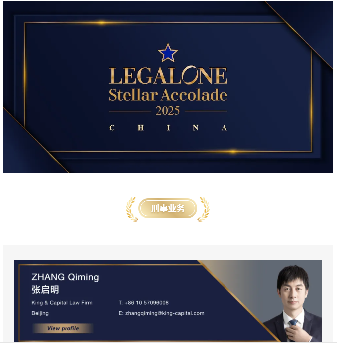On December 31, 2025, LegalOne, an internationally renowned professional rating agency, announced the list of “LegalOne Stellar Accolade” for the year of 2025, and Mr. Zhang Qiming, senior partner of Beijing Kyoto Law Firm, was awarded the “Stellar Accolade in Criminal Practice” for his profound criminal law practice. Mr. Zhang Qiming, Senior Partner of Beijing King&Capital Law Firm, was awarded the “Stellar Accolade in Criminal Practice” for his profound knowledge of criminal law practice, outstanding achievements in handling major cases and extensive influence in the industry.