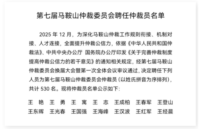 Complete Publication List: List of Arbitrators Appointed by the Seventh Maanshan Arbitration Commission