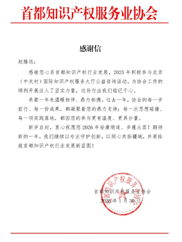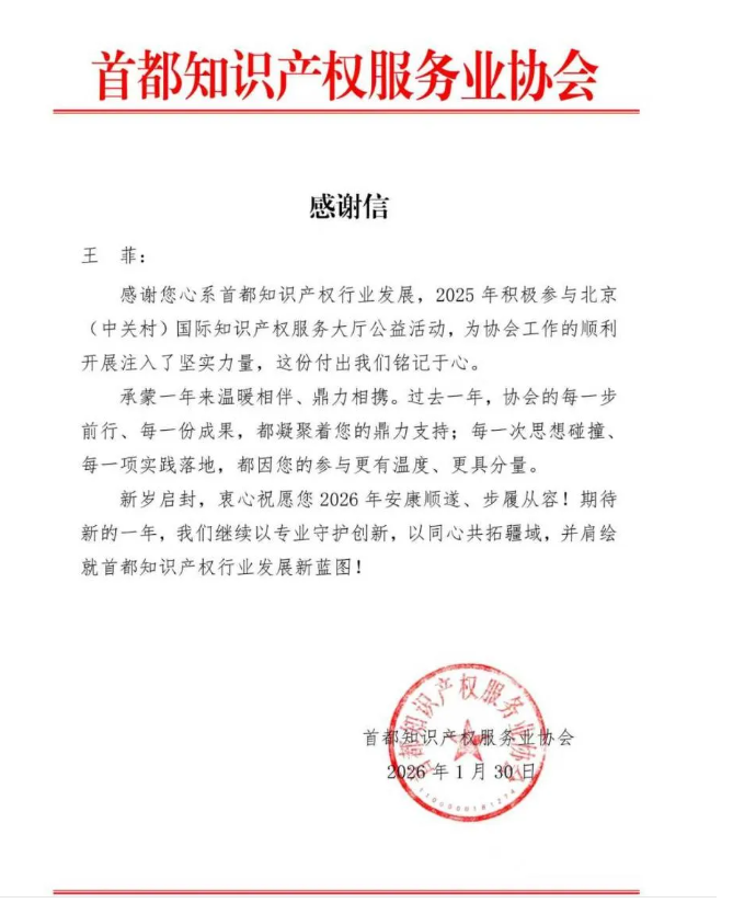 The Capital Intellectual Property Service Association mentioned in the letter of thanks that the active participation and selfless dedication of the two lawyers, Wang Fei and Zhao Tengyuan, had injected solid power into the smooth progress of the Association's public welfare counseling work, and made the public welfare service have both professional depth and temperature weight, which effectively boosted the public welfare service of intellectual property rights, and contributed to the promotion of the high-quality development of China's intellectual property service industry.