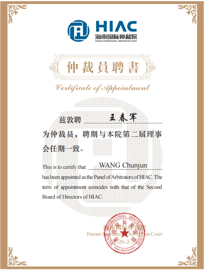 Recently, Hainan International Arbitration Court announced the roster of arbitrators, and King&Capital Law Firm senior partner and member of the management committee, Mr. Wang Chunjun, was successfully selected for his professionalism and rich experience in dispute resolution in the field of construction engineering.