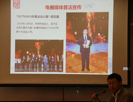稍后,合伙人刘铭律师和吴立伟律师分别介绍了京都普法系列活动、京都培养法律后备人才的高校“京都杯”系列活动。合伙人律师王九川还向在座的嘉宾介绍了他导演的微电影《同窗律师》中的拍摄剧照和拍摄花絮,讲述了如何用镜头的手法来描述律师自己的故事。这些年来,京都律师不忘“践行社会责任,推动法治建设”,积极投身各项社会公益事业,形成了京都独特的文化气息。