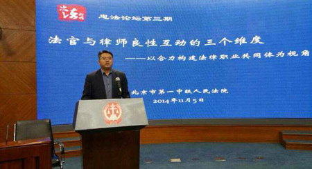 2014年11月5日下午,北京市第一中级人民法院第三期《忠法论坛》在东中法庭举行。本期论坛的主题是:法官与律师良性互动的三个维度——《法官语言语律师语言的互动》、《法官思维与律师思维的互动》、《法官职业和律师职业的互动》。本期论坛的目标是:在法律的框架下,以合力构建法律共同体为视角,以加强沟通、增进理解、促进诉讼进程为目标,构建良性互动机制,推动法律职业共同体的形成。京都律师事务所柳波律师应邀参加,并作《从刑事案件谈法官和律师的庭审语言艺术》的主题发言。柳波律师建议:语言是一种权力,法官和律师要慎用它,善用它。