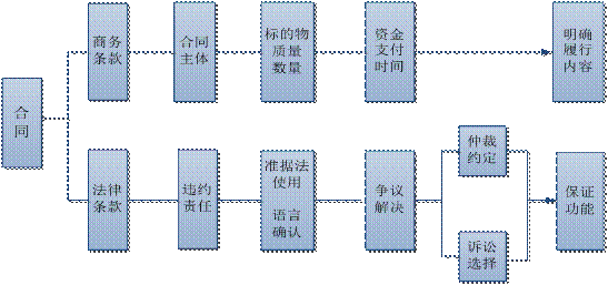 中国企业投资非洲基础设施,除了承担设计、采购、施工等义务外,对于当地资金匮乏的项目,还要承担投资者的角色。一套基础设施项目合同,除了包括EPC或BOT之类的大合同,也包括融资合同、采购合同、分包合同、施工合同及附属合同等一系列合同。一份规范严谨的合同,包括密不可分的两大部分——商务条款和法律条款,体现合同的两大基本功能——履行功能和保证功能。如下图: