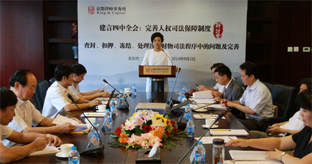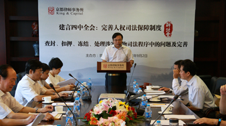 2014年9月2日,在党首次将“依法治国”定为主题的十八届四中全会即将召开之际,京都律师事务所邀请我国著名法学专家以及国内知名律师、媒体记者召开“建言四中全会:完善人权司法保障制度系列研讨会㈠”,探讨“查封、扣押、冻结、处理涉案财物司法程序中的问题及完善”,期待通过理论和实践的激烈碰撞,产生有建设意义的立法建议,为我国法治建设建言献策。