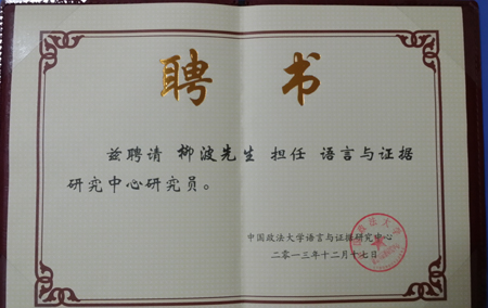 近日,我所合伙人柳波律师被中国政法大学语言与证据研究中心聘为研究员。