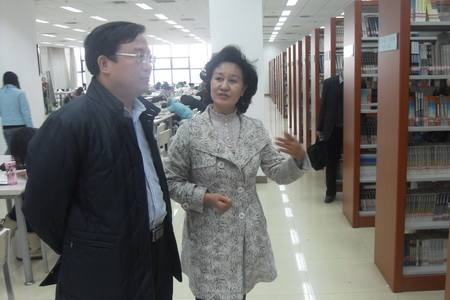 图为杨照东律师在法政学院院长李秀娟的陪同下参观吉利大学图书馆