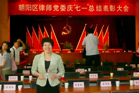 2009年6月29日下午,北京市朝阳区司法局党组、北京市朝阳区律师委员会在朝阳宾馆召开“庆七一总结表彰大会”,为获奖党支部和共产党员颁奖。市律协党委副书记、市律协会长张学兵,区委组织部常务副部长王小毛,区政法委常务副书记李中水,区委学习实践科学发展观活动指导一组组长齐国仲,区司法局党组书记、局长荣容,律师党委全体委员、各律师事务所党支部书记、先进支部和优秀党员、街乡司法所代表共二百余人参加了大会。