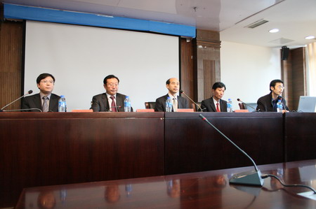 图为论坛现场(从左至右)我所合伙人杨照东律师,主任田文昌律师,中国人民大法学院副院长刘明祥教授,合伙人金杰律师
