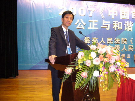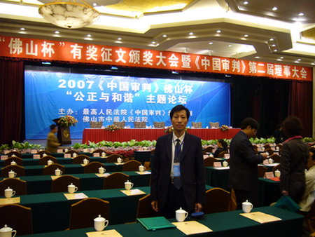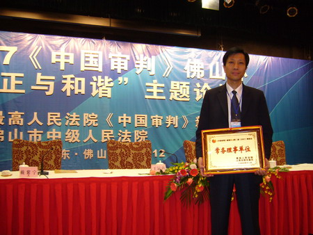 微风和煦,椰树环抱。2007年12月3日,人民法院出版社、《中国审判》新闻月刊编辑部在素有“南国陶都”的广州佛山召开了2007年《中国审判》佛山杯“公正与和谐”主题论坛暨第二届理事大会。最高人民法院副院长万鄂湘、有关省市法院院长及法院系统的部门负责人参加了会议。京都律师事务所名誉主任田文昌律师被《中国审判》聘为理事会常务理事。京都律所为《中国审判》常务理事单位,金杰律师代表我所参加了会议并作论坛发言。