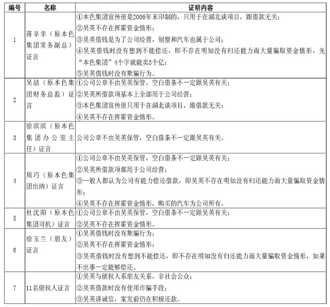(2)关于《判决书》所谓“虚构事实,隐瞒真相,骗取巨额资金”问题。大量证据表明,吴英借款时很少有人详细询问借款用途,因为债权人关心的是利息;吴英对借款用途的表述一般只是称做生意,而事实上除了一部分用于偿还借款本息以外,几乎全部用于经营;至于借款时称投资白马服饰城商铺和收购湖北荆门的酒店但实际并未投资于此的问题,只是极个别的情况,而且当初确实有该想法,只是后来情况变化没有成功而已;判决称“在社会上进行虚假宣传”属于子虚乌有,没有证据,也不符合事实。换句话说,无论律师提交的笔录还是侦查机关取得的笔录,被害人基本上都称吴英没有骗钱,是正常的民间借贷,不知法院凭什么认定“骗取”巨额资金呢?当然本色集团曾印刷过十几本宣传册,宣传册中有些夸张的内容,但该宣传册是为参加投标所用,并非为借款所用;而且宣传册于2006年12月印制,吴英最后一笔借款是同年11月,即宣传册在借款之后,与借款毫不相关。